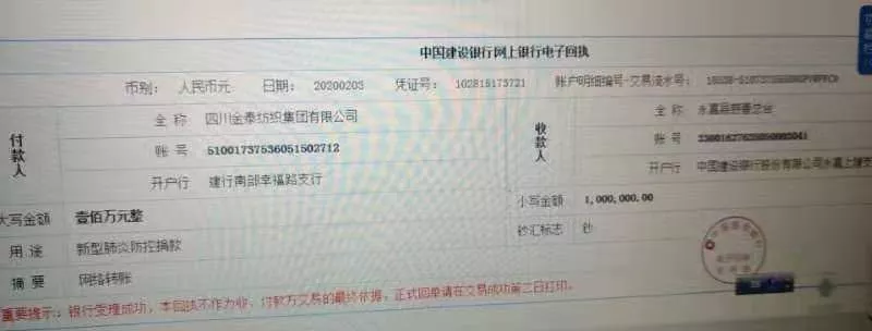 上午10時許,永嘉縣慈善總會收到了一筆特殊的網絡轉賬,記者在中國建設銀行網上銀行電子回折單上看到,付款人是四川金泰紡織集團有限公司,用途上寫著新型肺炎防控捐款,金額為一百萬元整。據永嘉縣慈善總會介紹,這筆捐款也是目前我縣收到的單筆最高捐款。